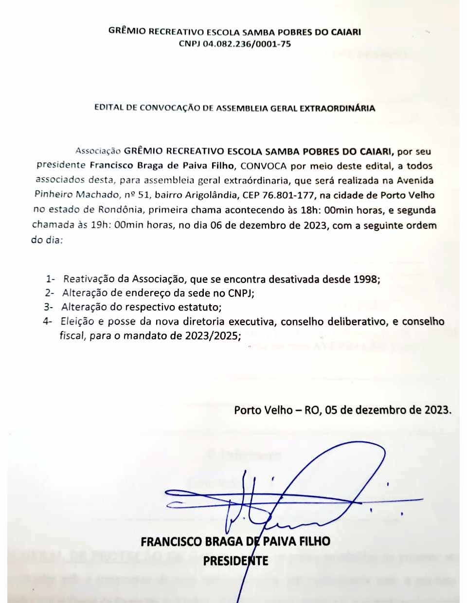 Edital de Convocação - Escola de Samba Pobres do Caiari