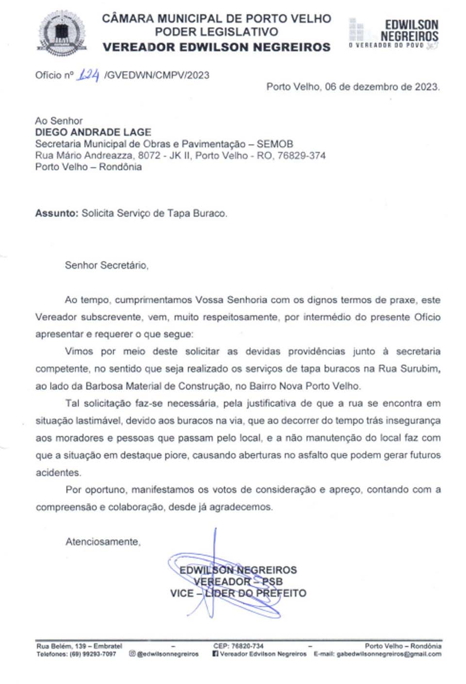 Negreiros enviou Ofício a Diego Andrade Lage, titular da Secretaria Municipal de Obras (SEMOB) abordando a necessidade de promoção de operação tapa-buracos no Bairro Nova Porto Velho.