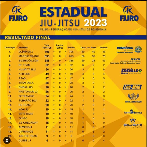Com uma diferença para o segundo lugar de apenas 13 pontos, a Equipe Olímpio/Leão de Judá foi a grande vencedora do campeonato totalizando uma pontuação de 706 pontos, conquistando 60 medalhas de ouro, 40 de prata e 46 de bronze. A segunda posição ficou com a equipe de Márcio Frank, que somou 693 pontos ao totalizar 50 medalhas de ouro, 56 de prata e 75 de bronze. O terceiro lugar foi conquistado pela equipe Bushidô/Legado, que acumulou 388 pontos com 29 medalhas de ouro, 28 de prata e 43 de bronze. Confira quadro geral abaixo.