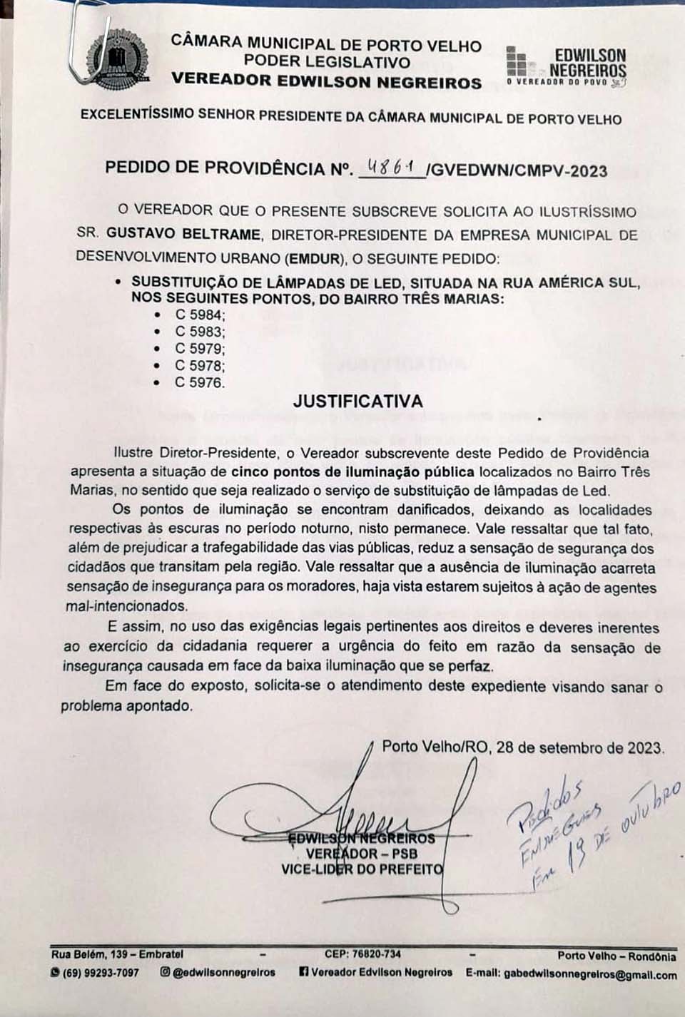 No documento, Negreiros apontou a necessidade de substituição de lâmpadas de led cinco pontos da Rua América do Sul, no Bairro Três Marias, zona Leste da Capital.