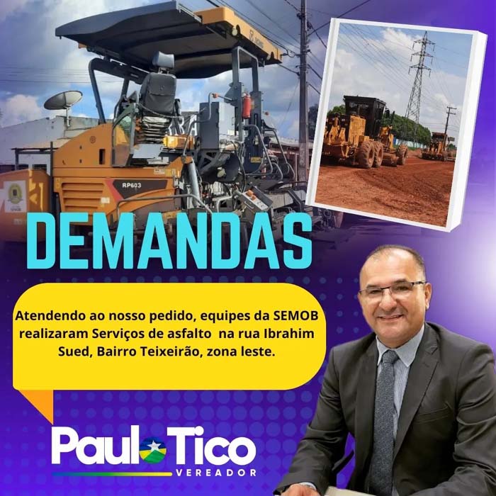 Porto Velho;RO - O Vereador Paulo Tico teve mais um pedido de providência atendido pela Prefeitura de Porto Velho. Desta vez foram realizados serviços de pavimentação asfáltica na rua Ibrahim Sued, entre as venidas José Vieira Caula e Amazonas, no bairro Teixeirão.