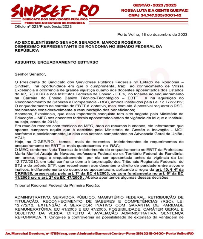 Além do Senador Marcos Rogério, o Sindsef encaminhou correspondência idêntica a todos os deputados e deputadas federais e aos demais senadores de Rondônia (Confúcio e Bagattoli), encaminhando minuta dos mesmos documentos aos sindicatos de servidores públicos federais do AP e RR, para mobilizarem os parlamentares federais daquelas unidades federadas.