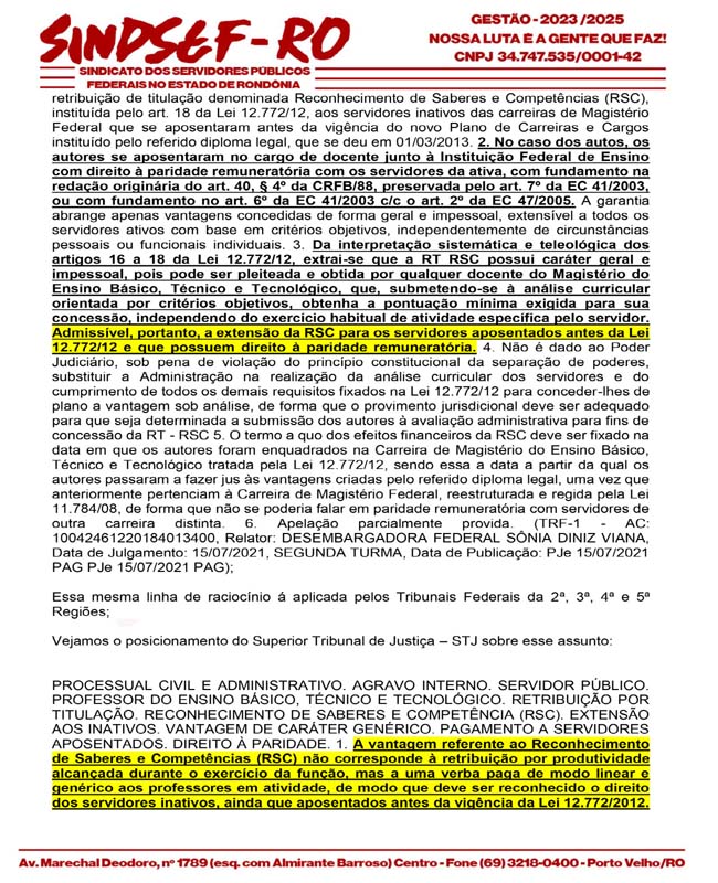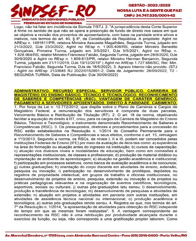 Além das medidas jurídicas, o Sindsef também busca soluções administrativas junto ao MEC, Ministério da Gestão e Inovação – MGI e Advocacia Geral da União - AGU, pois os tribunais federais regionais, STJ e STF reconhecem o direito de enquadramento na carreira do EBTT e ao RSC a todos os docentes aposentados antes da vigência da lei instituidora.