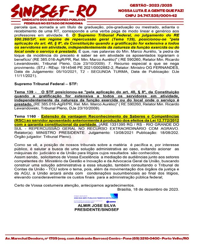 Vale destacar o empenho do ex-presidente do Sindsef, Daniel Pereira, que defende a causa dos docentes com elaboração de ofícios direcionados aos deputados e senadores de Rondônia cobrando uma ação perante os órgãos competentes.