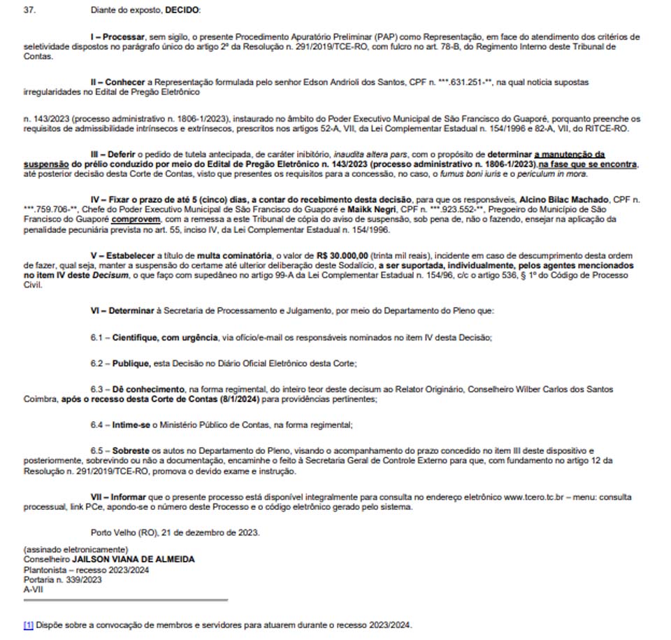 Porto Velho, RO – O Tribunal de Contas do Estado de Rondônia (TCE/RO) proferiu decisão determinando a suspensão do Edital de Pregão Eletrônico n. 143/2023, referente à contratação de empresa para prestação de serviço de fornecimento de Software Integrado para Gestão Administrativa, Tributária, Orçamentária e Financeira no âmbito do Poder Executivo Municipal de São Francisco do Guaporé. A medida foi tomada em resposta a um Procedimento Apuratório Preliminar (PAP) instaurado após denúncias de supostas irregularidades no certame.