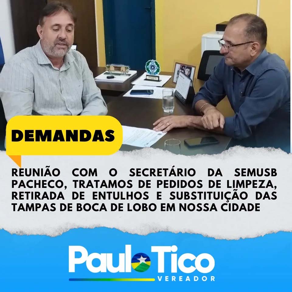 "Me reuni com o secretário da Semusb, Cleberson Pacheco, e na oportunidade tratamos dos pedidos de providência de minha autoria para serviços de Limpeza, retirada de entulhos e substituição das tampas de boca de lobo em nossa cidade”, relatou o verador Paulo Tico.