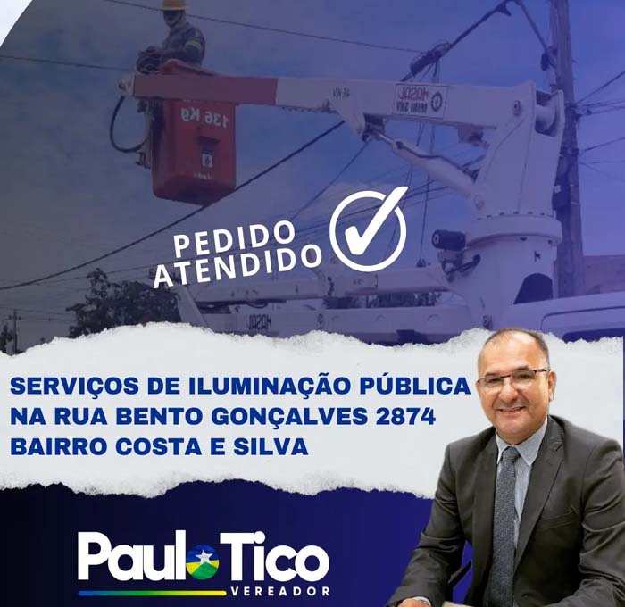 "Atendendo ao nosso pedido, equipes da EMDUR realizaram serviços de Iluminação pública na rua Bento Gonçalves no bairro Costa e Silva. Agradeço ao prefeito Hildon Chaves, ao presidente da EMDUR Gustavo Beltrame e toda a sua equipe", ressaltou Paulo Tico.