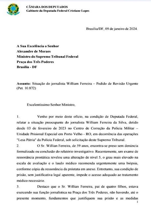 A deputada federal Cristiane Lopes (União Brasil), manifestou sua preocupação com a saúde do jornalista William Ferreira, em ofício enviado ontem, 09 de janeiro de 2024, ao Ministro Alexandre de Moraes do Supremo Tribunal Federal (STF).