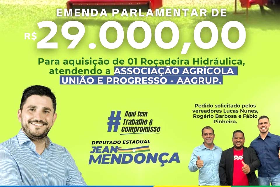 Primavera de Rondônia;RO - O Deputado Jean Mendonça anunciou no início desta semana, a destinação de recursos para Associação Agrícola União - AAGRUP, no município de Primavera de Rondônia.
