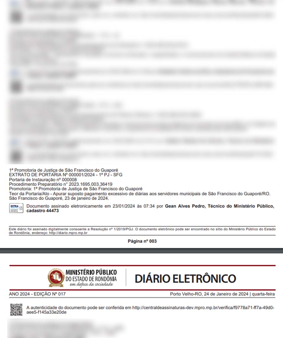 Porto Velho, RO – A 1ª Promotoria de Justiça de São Francisco do Guaporé emitiu o Extrato de Portaria nº 000001/2024, informando sobre a instauração do Procedimento Preparatório nº 2023.1695.003.36419. A investigação tem como foco apurar um suposto pagamento excessivo de diárias aos servidores municipais de São Francisco do Guaporé.