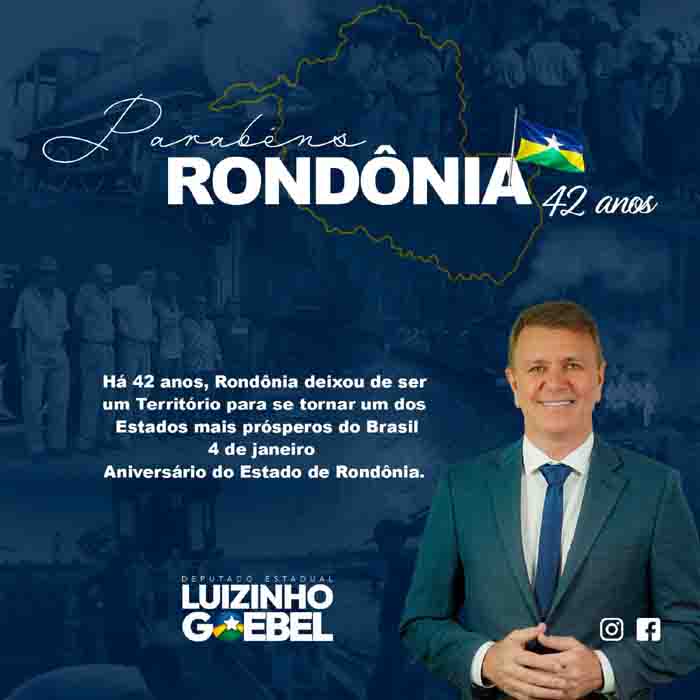 Porto Velho;RO - O Deputado Estadual Luizinho Goebel, nesta quinta-feira (4), usou sua rede social para parabenizar a população de Rondônia pelo aniversário de 42 anos de Instalação do Estado.