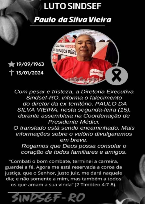 Sindicato dos Servidores Públicos Federais no Estado de Rondônia (Sindsef) comunicou e lamentou o falecimento de Paulo da Silva Vieira.