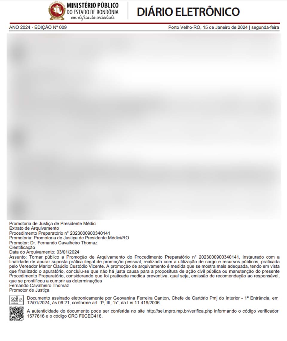 Porto Velho, RO – A Promotoria de Justiça de Presidente Médici, em Rondônia, emitiu o Extrato de Arquivamento referente ao Procedimento Preparatório n° 2023000900340141, instaurado para apurar suposta prática ilegal de promoção pessoal pelo Vereador Marlon Claudio Custodio Vicente, presidente da Câmara Municipal. O procedimento foi conduzido pelo Promotor de Justiça Dr. Fernando Cavalheiro Thomaz.
