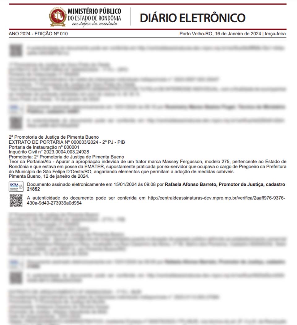A decisão, assinada eletronicamente em 15/01/2024 pela promotora de Justiça Rafaela Afonso Barreto, visa angariar elementos que permitam a adoção de medidas cabíveis diante da suspeita de apropriação indevida do trator pertencente ao Estado.