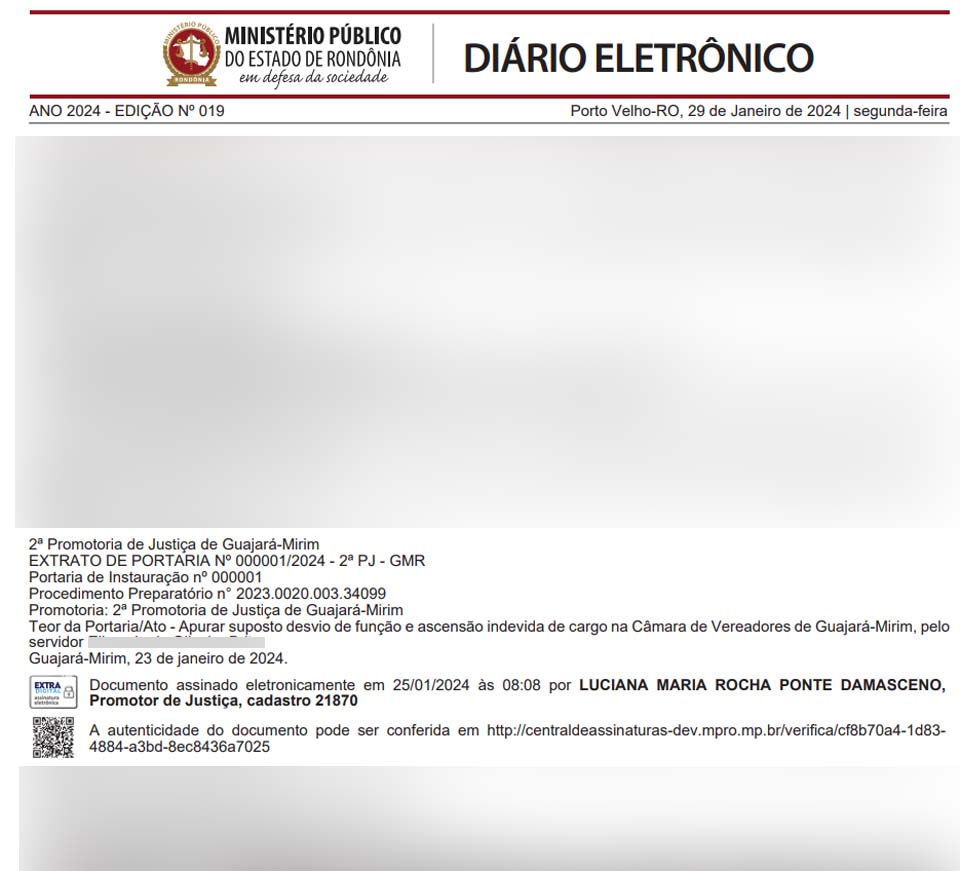 A portaria, assinada eletronicamente em 25/01/2024 por Luciana Maria Rocha Ponte Damasceno, promotora de Justiça com o cadastro número 21870, estabelece que o Procedimento Preparatório visa esclarecer as circunstâncias envolvendo o mencionado servidor e sua atuação na Câmara de Vereadores de Guajará-Mirim.