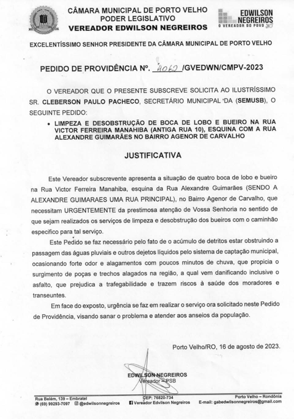 Porto Velho, RO – O vereador Edwilson Negreiros, representante do PSB em Porto Velho, apresentou um Pedido de Providência à Secretaria Municipal de Serviços Básicos (SEMUSB). O documento dirigido ao titular da pasta municipal solicitava intervenção na Rua Victor Ferreira Manahiba (Antiga Rua 10), esquina com a Rua Alexandre Guimarães, localizada no Bairro Agenor de Carvalho.