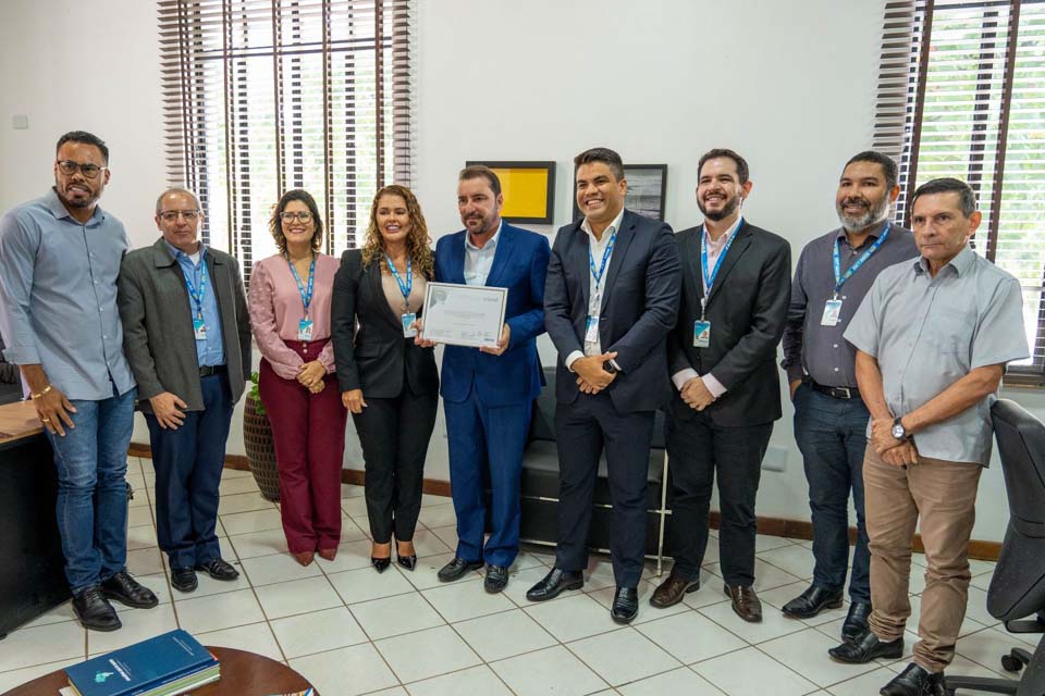 O superintendente da Caixa em Rondônia, Dione Wesley, a superintendente de Governo, Marta Helena, o superintendente de Habitação, Wellington Amaral, o coordenador de Habitação, Ricardo Gusmão, a gerente de Governo, Rosane Gomes, e o coordenador de Governo, Franklin Brito, fizeram a entrega do Selo Caixa Gestão Sustentável. O secretário-adjunto da Secretaria Geral de Governo (SGG), Devanildo Santana, também participou do encontro.