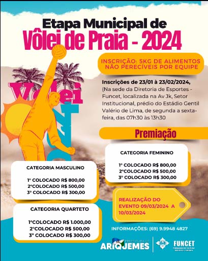 A Prefeitura de Ariquemes, através da Fundação de Cultura, Esporte e Turismo - FUNCET, abriu inscrições para a Etapa Municipal de Vôlei de Praia em 03 categorias, masculino, feminino e quarteto.
