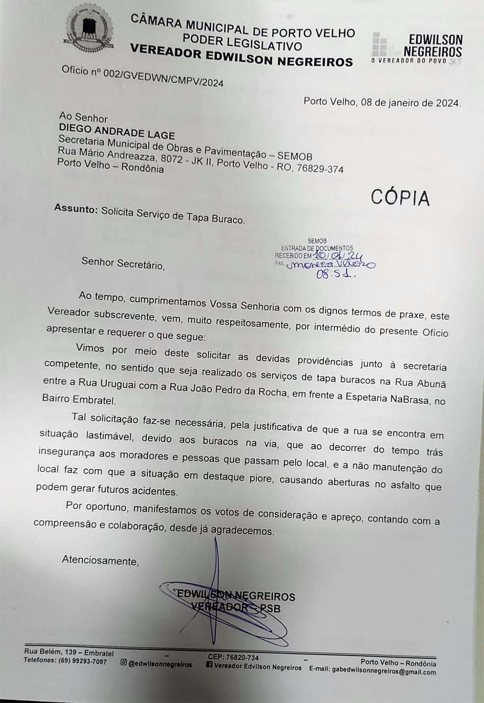 Porto Velho, RO – Um Pedido de Providência apresentado pelo vereador Edwilson Negreiros, do PSB, se transformou em serviços executado na cidade. Negreiros enviou Ofício a Diego Andrade Lage, titular da Secretaria Municipal de Obras (SEMOB) abordando a necessidade de promoção de serviços de tapa-buracos em frente a determinado restaurante.