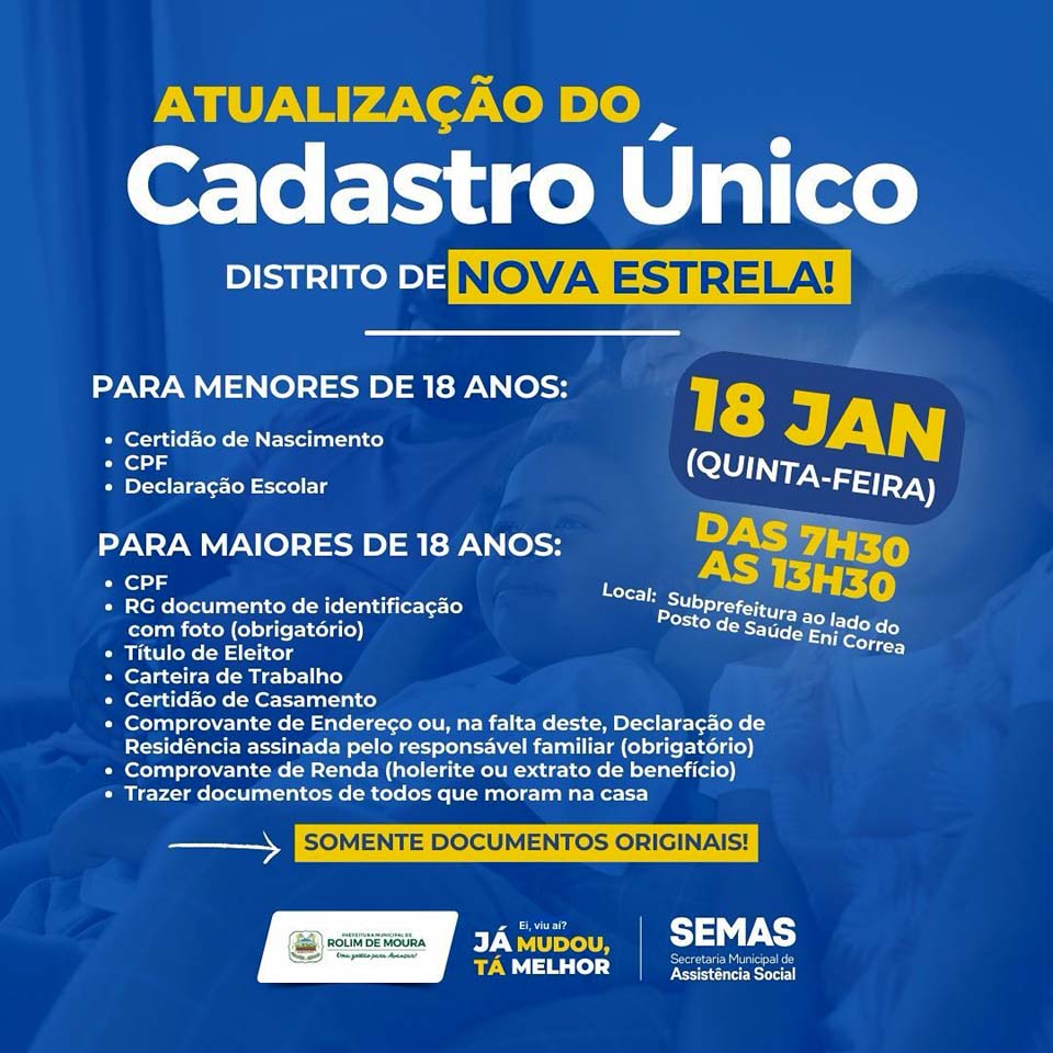 Rolim de Moura;RO – A Prefeitura de Rolim de Moura infoma sobre atualização do CadÚnico no Distrito Nova Estrela. Confira documentos necessários.