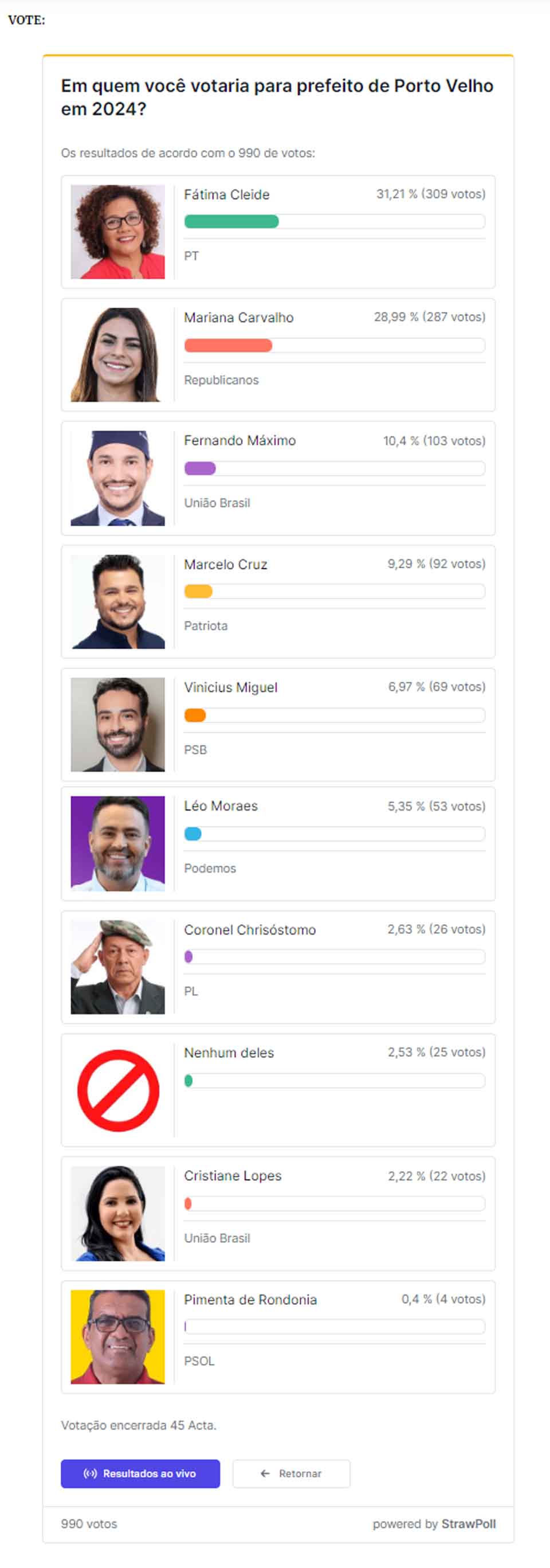 Porto Velho, RO – Na última quinta-feira (25), o jornal eletrônico Rondônia Dinâmica lançou enquete para saber dos seus leitores e leitoras quem dentre nove pré-candidatos teria maiores condições de ser eleito prefeito de Porto Velho em 2024.