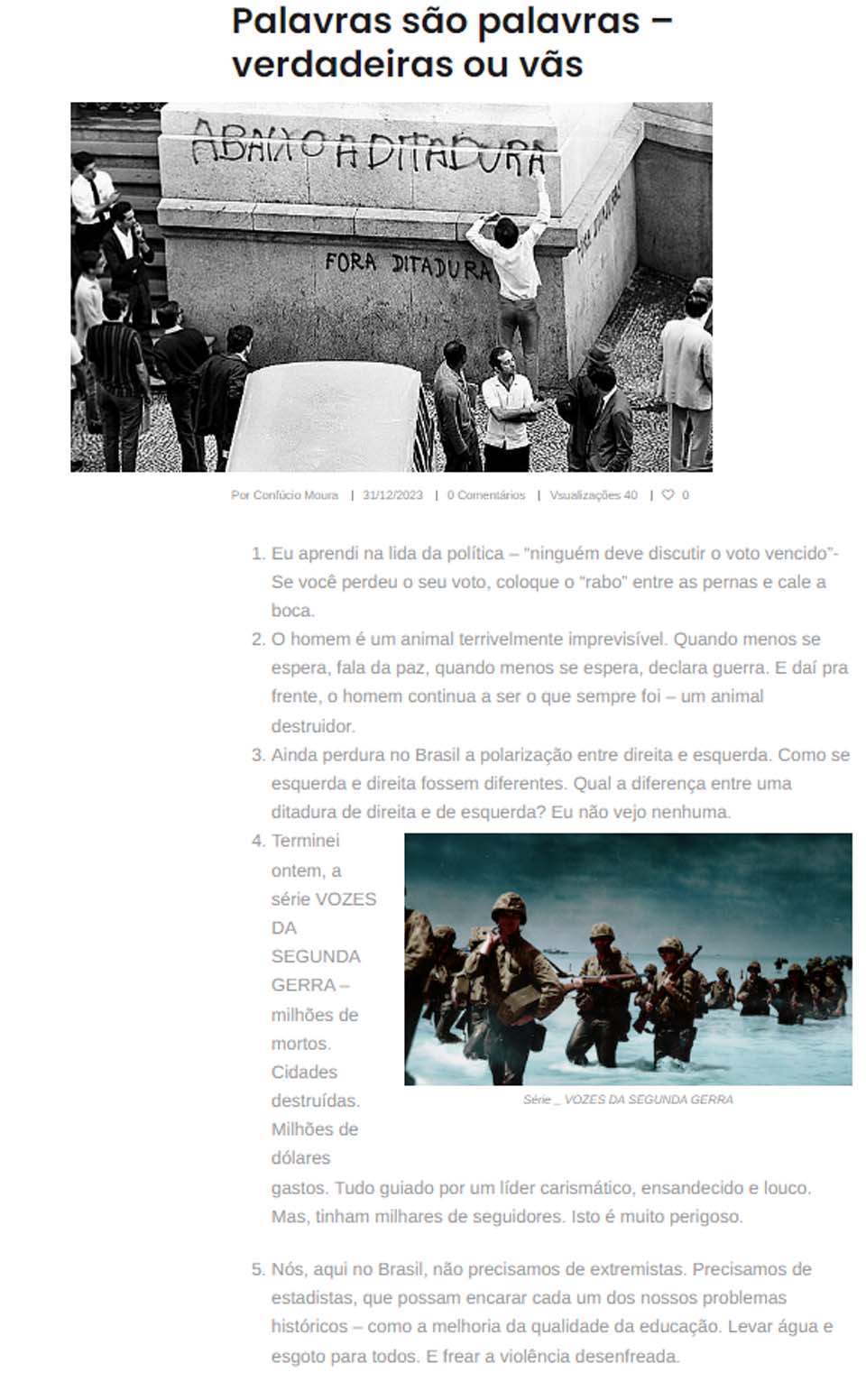 A série "VOZES DA SEGUNDA GERRA" é mencionada como parte do repertório do senador, que destaca os horrores do conflito e alerta para os perigos de seguir líderes carismáticos, mesmo que ensandecidos. O senador ressalta a importância de evitar extremistas no Brasil, apontando a necessidade de estadistas comprometidos em enfrentar questões históricas urgentes, como a melhoria da educação, a universalização do acesso a água e saneamento, e o combate à crescente violência.
