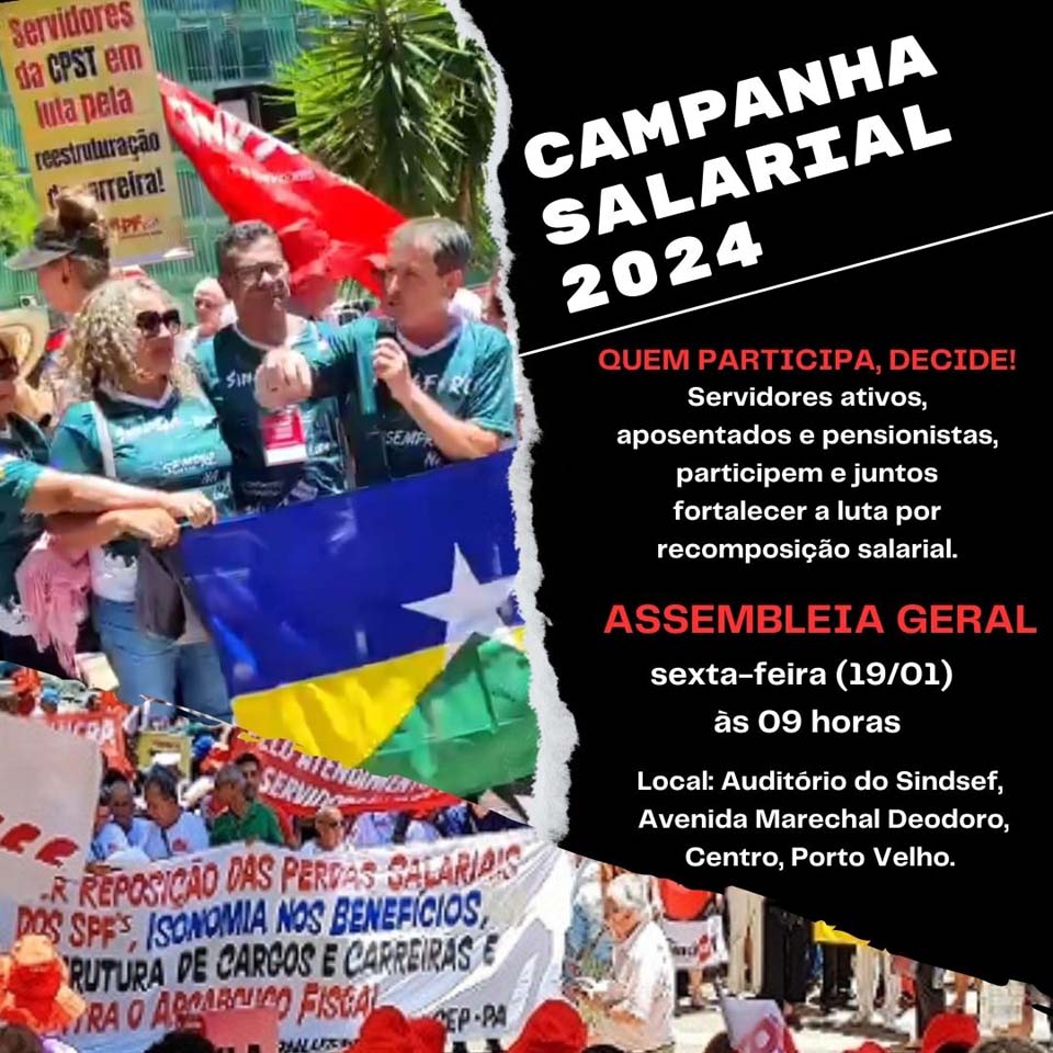 O Sindicato dos Servidores Públicos Federais no Estado de Rondônia – Sindsef/RO convoca todos os servidores federais, ativos, aposentados e pensionistas para Assembleia Geral Extraordinária a realizar-se nesta sexta-feira, dia 19 de janeiro, às 9 horas, no auditório da sede administrativa, na Avenida Marechal Deodoro, Centro, para discutir e deliberar sobre a seguinte pauta: proposta do governo sobre a campanha salarial de 2024.