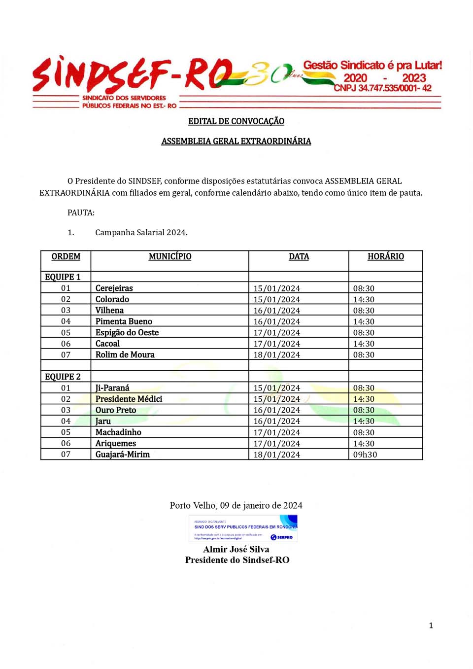 Porto Velho;RO - O SINDSEF-RO convoca assembleias gerais nas Coordenações para debater campanha salarial; Confira Edital com calendário de cada regional.