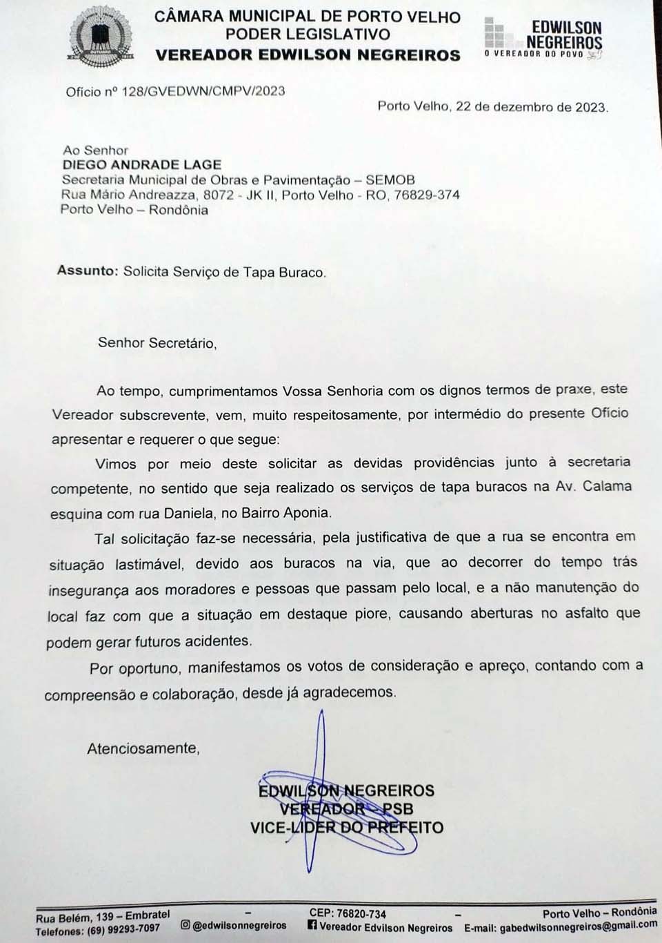 Negreiros deixou claro, à ocasião do pedido, que a diligência da pasta municipal no local seria imprescindível o quanto antes, visto que, por conta das falhas na malha asfáltica, a população ficou prejudicada em relação à mobilidade e o trânsito de veículos também.