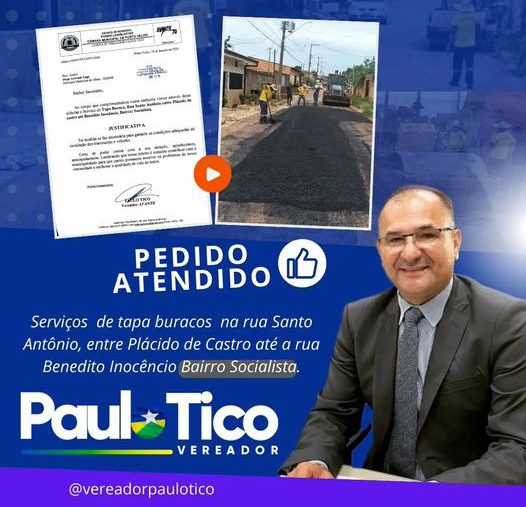 Porto Velho;RO - A atuação do vereador Paulo Tico (Avante), é uma das mais elogiadas da atual legislatura na Câmara de Porto Velho. Prestigiado pela municipalidade, o parlamentar teve pedidos oriundo de seu gabinete atendidos pelas equipes da Secretaria Municipal de Obras-SEMOB.