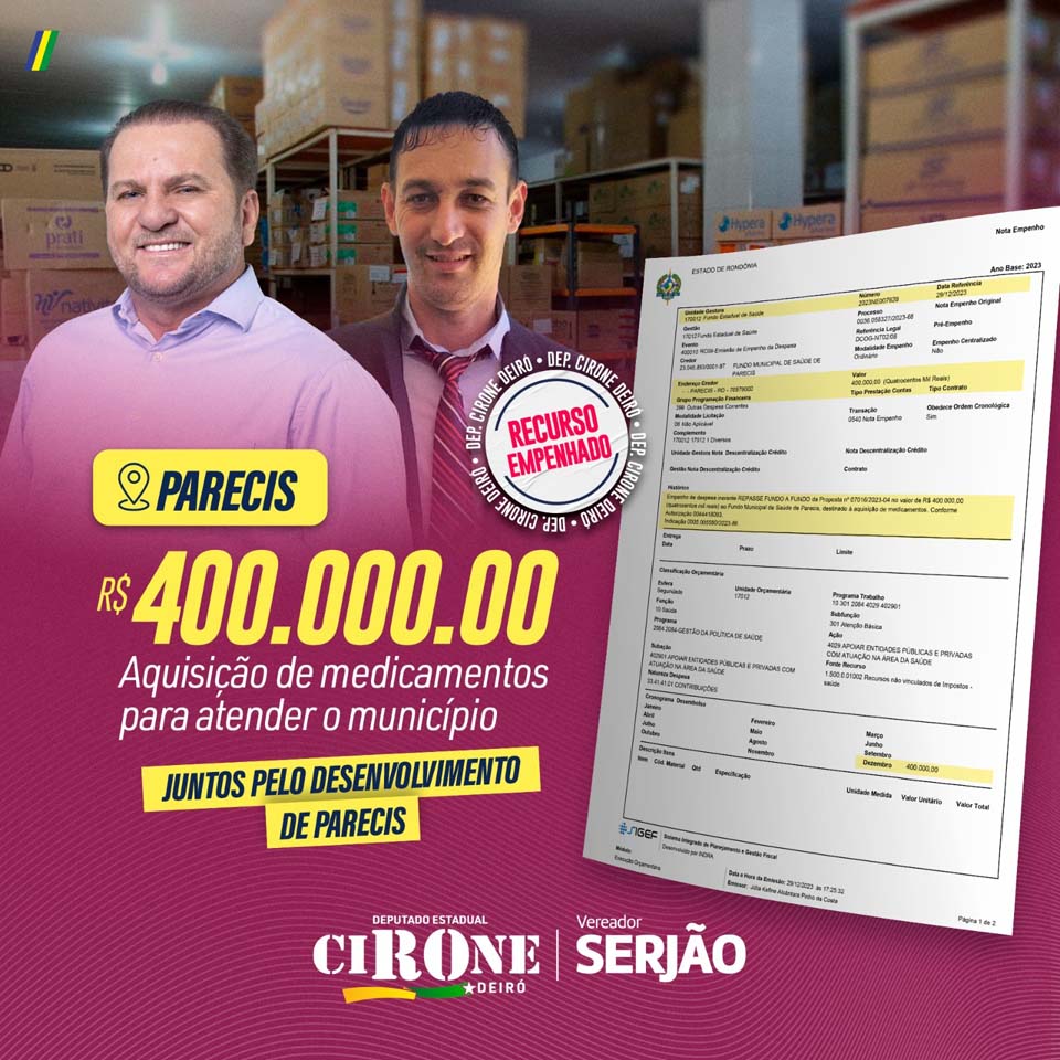 Parecis;RO – O Deputado Estaual Cirone Deiró destinou na última semana, recurso na ordem R$ 400 mil, por meio de emenda de sua autoria, para aquisição de medicamantos para atender o município de Parecis.
