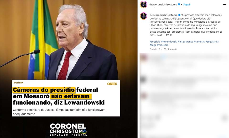 Porto Velho, RO – Na esteira dos recentes acontecimentos envolvendo a fuga de detentos na Penitenciária Federal de Mossoró, o deputado de Rondônia, Coronel Chrisóstomo, do PL, fez uso das redes sociais para tecer críticas aos posicionamentos do ministro da Justiça, Ricardo Lewandowski, e do ex-ministro da mesma pasta, Flávio Dino, que ocupará uma cadeira no Supremo Tribunal Federal (STF) a partir do dia 22 de fevereiro, data marcada para a posse.