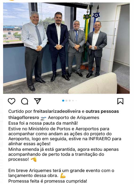 O deputado federal Thiago Flores (MDB) anunciou em suas redes sociais, a obra de execução do aeroporto de Ariquemes.
