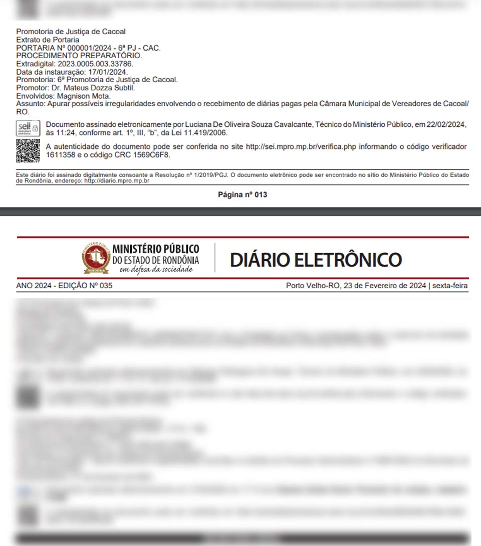 Segundo o documento, o procedimento tem como objetivo apurar possíveis irregularidades envolvendo o recebimento de diárias pelo envolvido Magnison Mota, em nome da Câmara Municipal de Cacoal. A investigação busca esclarecer os fatos e garantir a transparência e a legalidade na gestão dos recursos públicos.
