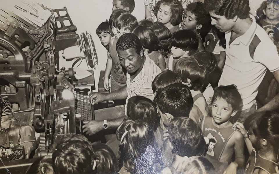 Foto: O linotipista Maranhão, observado do jornalista Edinho, mostra a linotipo e fala de suas funções a crianças da escola “Chapeuzinho Vermelho”