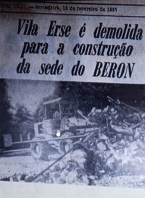 Foto: Jornal Alto Madeira, 15.2.1985 – a máquina derrubando a “Vila Erse” para dar lugar à sede do Beron, atual “Casa de Cultura “Ivan Marrocos”.