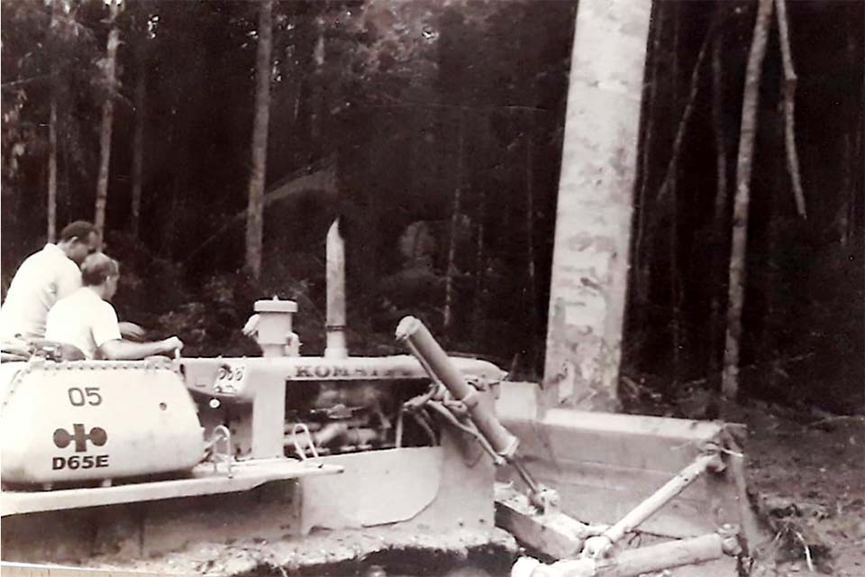 1976 – O governador Humberto Guedes pilota o trator D-6 na derrubada da primeira árvore, iniciando o trabalho de definição de ruas e quadras de Ariquemes. FOTO DO DIA