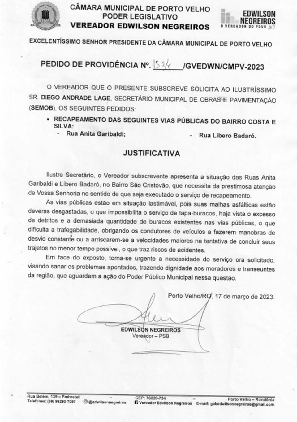 Porto Velho, RO – O vereador da Câmara de Porto Velho Edwilson Negreiros, do PSB, encaminhou Pedido de Providência a Diego Andrade Lage, titular da Secretaria Municipal de Obras e Pavimentação (SEMOB) na gestão Hildon Chaves (PSDB).