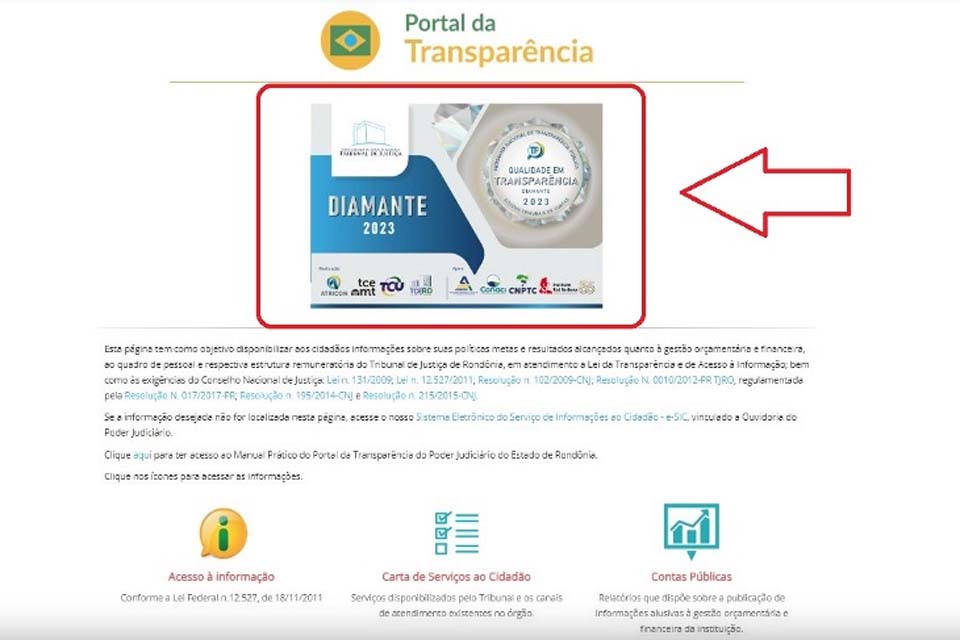 Certificação que atesta a qualidade do Portal da Transparência do Poder Judiciário de Rondônia, pela segunda vez consecutiva, com a classificação diamante, foi enviada neste mês de fevereiro ao Tribunal de Justiça para a fixação na própria página em questão, para que o público em geral saiba da qualidade dos dados que estão disponíveis.