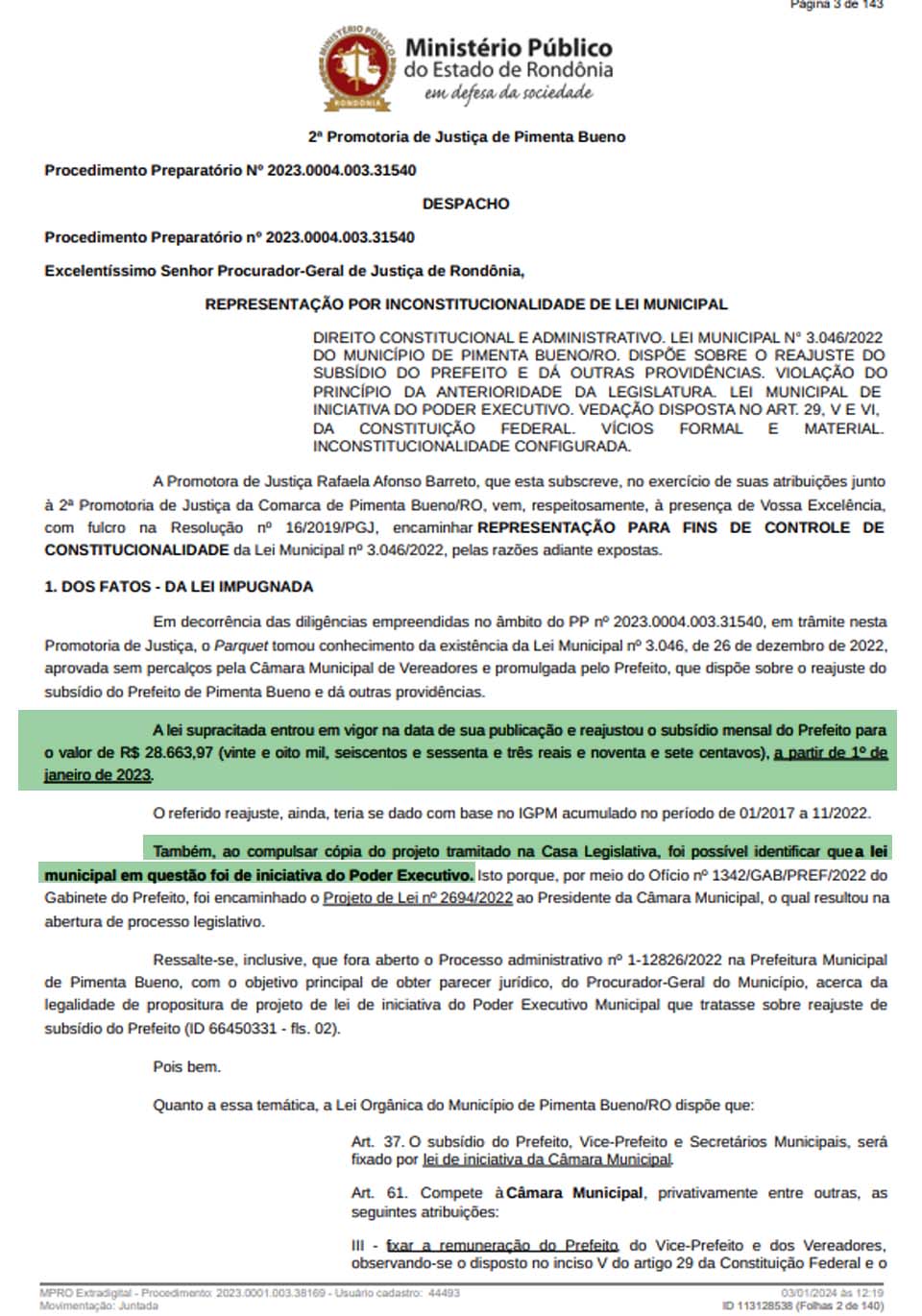 "Depreende-se, no presente caso, que foi editada no município de Pimenta Bueno, norma de autoria do Poder Executivo, aumentando a remuneração do próprio Chefe da municipalidade, para a legislatura em voga, embora as Constituições Federal e Estadual sejam expressas ao estipular que o subsídio deve ser fixado em cada legislatura para a subsequente e por iniciativa do Poder Legislativo", anotou o procurador-geral de Justiça.