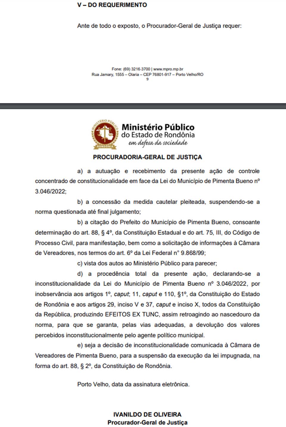 Na solicitação à Justiça, o Procurador-Geral de Justiça de Rondônia requereu a autuação e recebimento da presente ação de controle concentrado de constitucionalidade em face da Lei Municipal de Pimenta Bueno nº 3.046/2022, bem como a concessão da medida cautelar pleiteada, suspendendo-se a norma questionada até o final do julgamento.