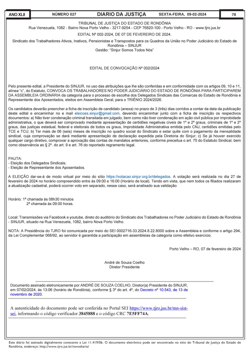 Pelo presente edital, a Presidente do SINJUR, no uso das atribuições que lhe são conferidas e em conformidade com os artigos 09, 10 e 11, alínea “c”, do Estatuto, CONVOCA OS TRABALHADORES NO PODER JUDICIÁRIO DO ESTADO DE RONDÔNIA PARA PARTICIPAREM DA ASSEMBLEIA ORDINÁRIA da categoria para o processo de escolha dos Delegados Sindicais das Comarcas do Estado de Rondônia e Representante dos Aposentados, eleitos em Assembleia Geral, para o TRIÊNIO 2024/2026.