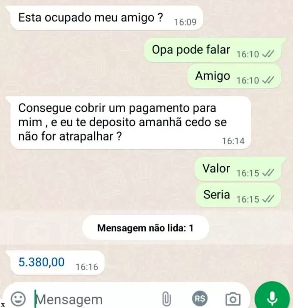 O parlamentar relatou ter percebido a clonagem de sua conta quando recebeu mensagens suspeitas de amigos e colegas. O criminoso, se passando pelo vereador, tentou aplicar golpes solicitando dinheiro, como mostra imagem abaixo.