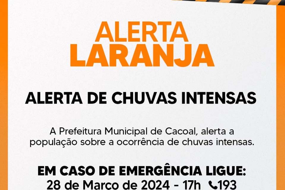 A Prefeitura Municipal de Cacoal emitiu um alerta laranja para chuvas intensas que devem atingir a região. As autoridades estão alertando população para a possibilidade de fortes precipitações que podem levar a inundações e outros incidentes relacionados ao clima severo.