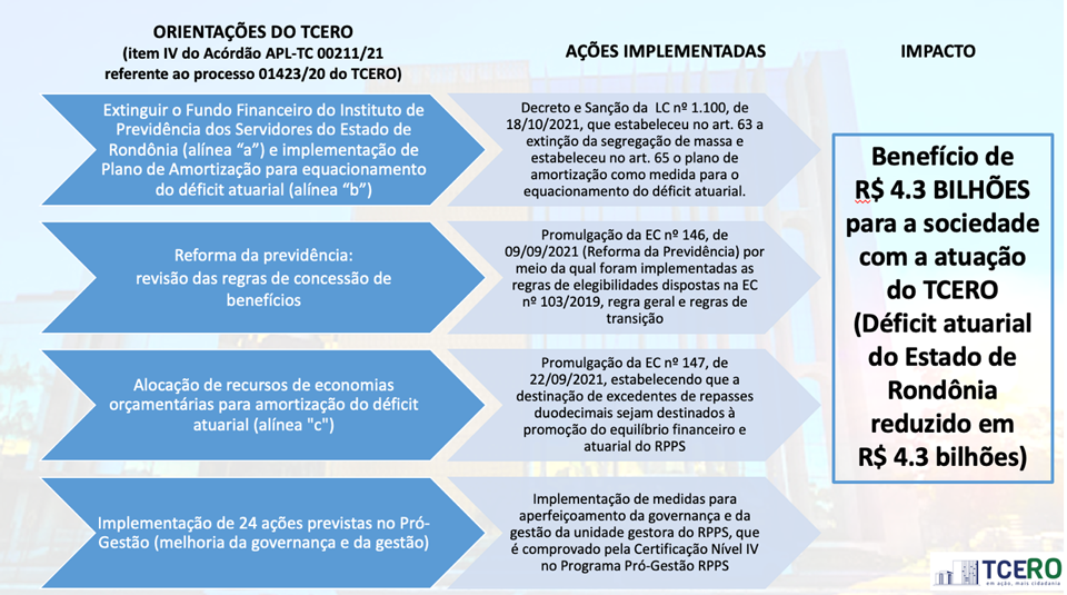 Em Rondônia, após as autoridades do Estado seguirem uma série de medidas sugeridas pelo TCE-RO, houve diminuição do déficit atuarial em R$ 4,3 bilhões, e o prazo para equacionamento do déficit atuarial (estimado em aproximadamente R$ 15 bilhões), que antes era de 75 anos, caiu para 35 anos.