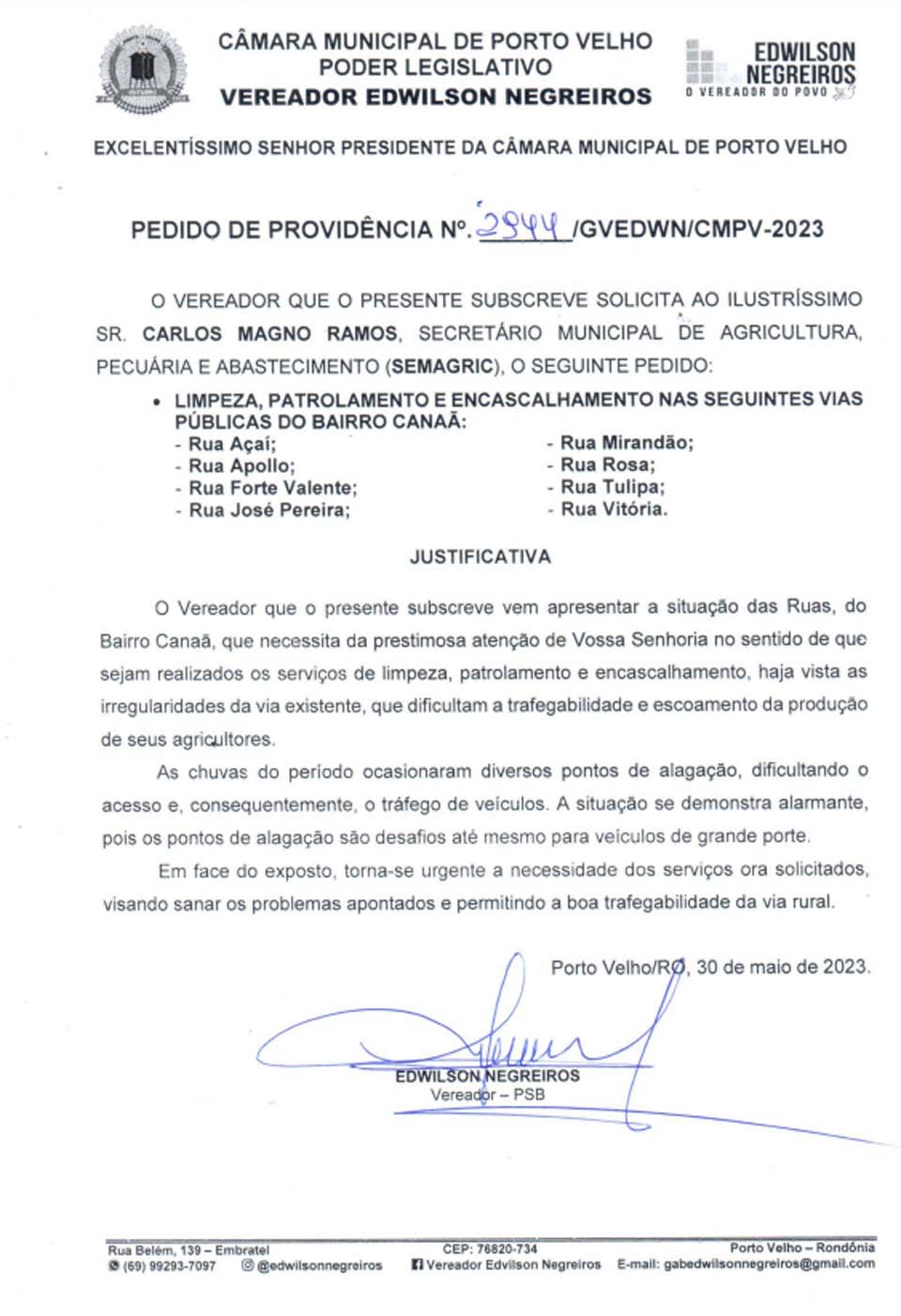 Porto Velho, RO – O vereador Edwilson Negreiros, do PSB, encaminhou um Pedido de Providência à Secretaria Municipal de Agricultura, Pecuária e Abastecimento (SEMAGRIC), sob comando do titular Carlos Magno Ramos, solicitando intervenção e serviços de limpeza, patrolamento e encascalhamento em oito ruas do Bairro Canaã, em Porto Velho. O pedido foi feito devido às irregularidades nas vias, que estavam dificultando a trafegabilidade e o escoamento da produção agrícola local.