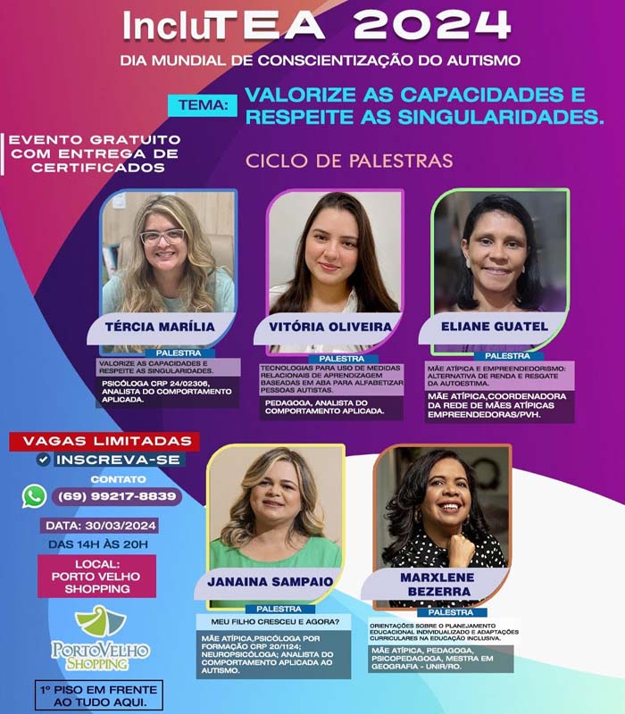 Nos dias 30 e 31 de março, em alusão ao Dia Mundial da Conscientização do Autismo que é celebrado no dia 2 de abril, o Porto Velho Shopping, será palco do evento "IncluTEA – Inclusão da Pessoa com Transtorno do Espectro Autista”. A programação contará com Ciclo de Palestras, Espaço KIDS para as crianças, Feira de Empreendedorismo – Mães Atípicas e soltura de balões no dia 31.