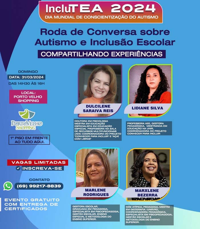 A roda de conversa contará com uma equipe especializada, em que os participantes poderão tirar dúvidas acerca do TEA. Dentre as especialistas estão Dulcilene Saraiva Reis, doutora em Psicologia, mestra em Educação, especialista em Educação Especial Professora na Sala de Recursos Multifuncionais (AEE) e coordenadora do Projeto "Conhecer para Incluir" e "Açaí com Libras"; Lidiane Silva dos Santos, professora (AEE), gestora pedagógica, mestranda em Educação e coordenadora do Projeto Conhecer para Incluir; Marlene Rodrigues da Silva Benedito, gestora escolar, pedagoga, especialista em Psicopedagogia, Gestão Escolar, Ensino Especial e Metodologia do Ensino Superior e pela coordenadora do evento, Marxlene Bezerra.