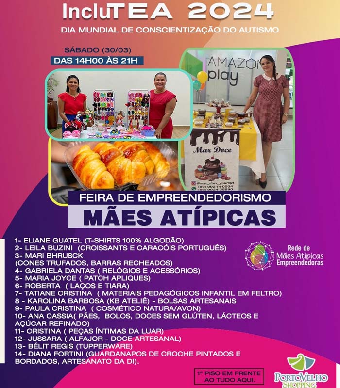 Durante todo o evento acontece a Feira de Empreendedorismo - Mães Atípicas e o Espaço KIDS TEAmo. No dia 31 de março acontece a soltura de balões, às 17 horas em frente ao Chafariz do Porto Velho Shopping e a presença da Defensoria Pública representada pelas defensoras Flávia Albaine e Luzinete Xavier de Souza, que é presidente da Comissão de Defesa dos Direitos da Pessoa com Deficiência.