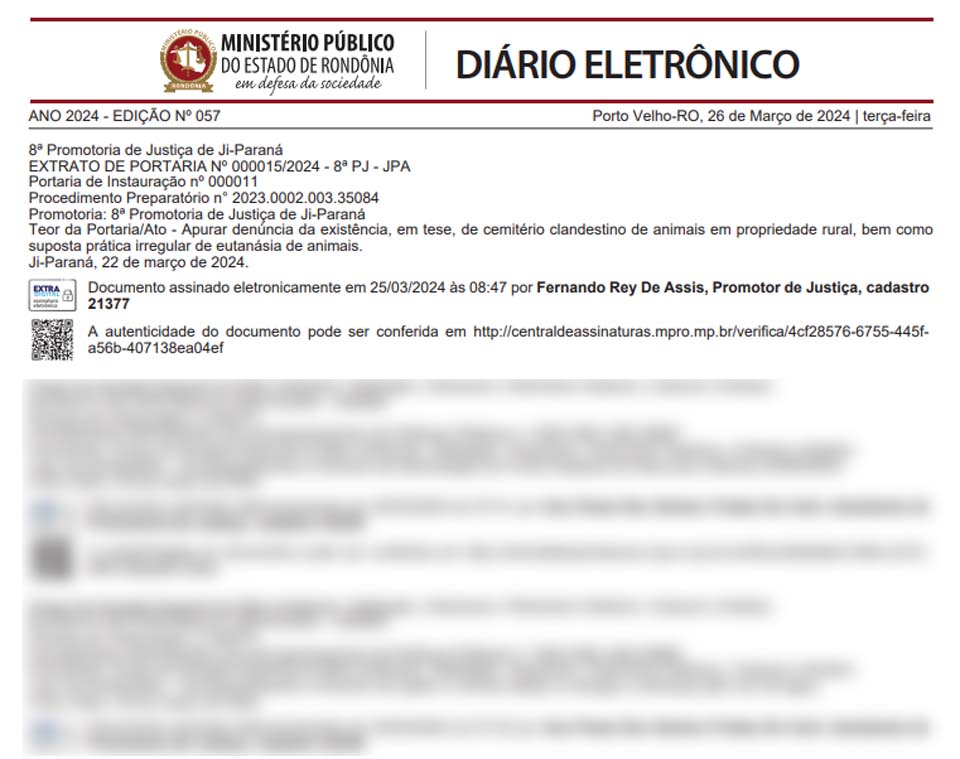 O documento, assinado eletronicamente pelo Promotor de Justiça Fernando Rey De Assis, tem como objetivo apurar uma denúncia de grave natureza: a existência, em tese, de um cemitério clandestino de animais em uma propriedade rural da região, além de uma suposta prática irregular de eutanásia desses animais.